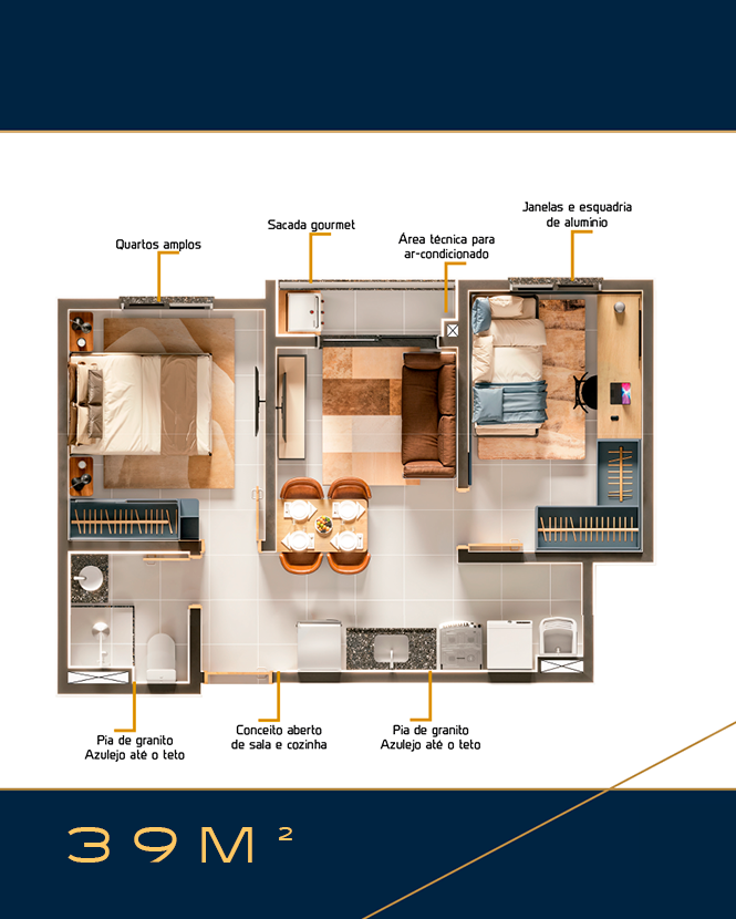 Apartamentos com 1 a 2 dormitórios, opções com suíte, varanda gourmet com ponto para churrasqueira e garagem coberta. Um projeto pensado para oferecer praticidade, bem-estar e uma experiência de moradia que transforma o cotidiano.