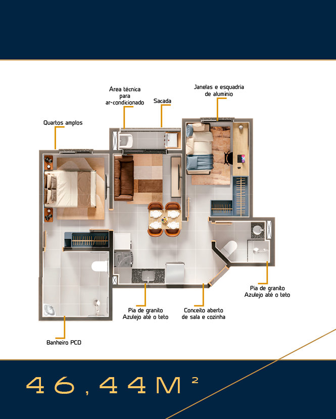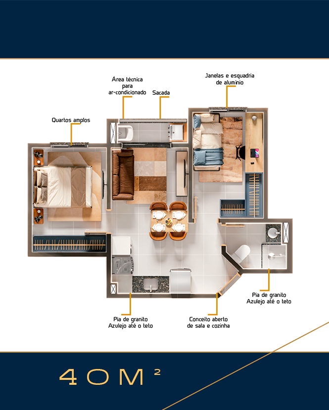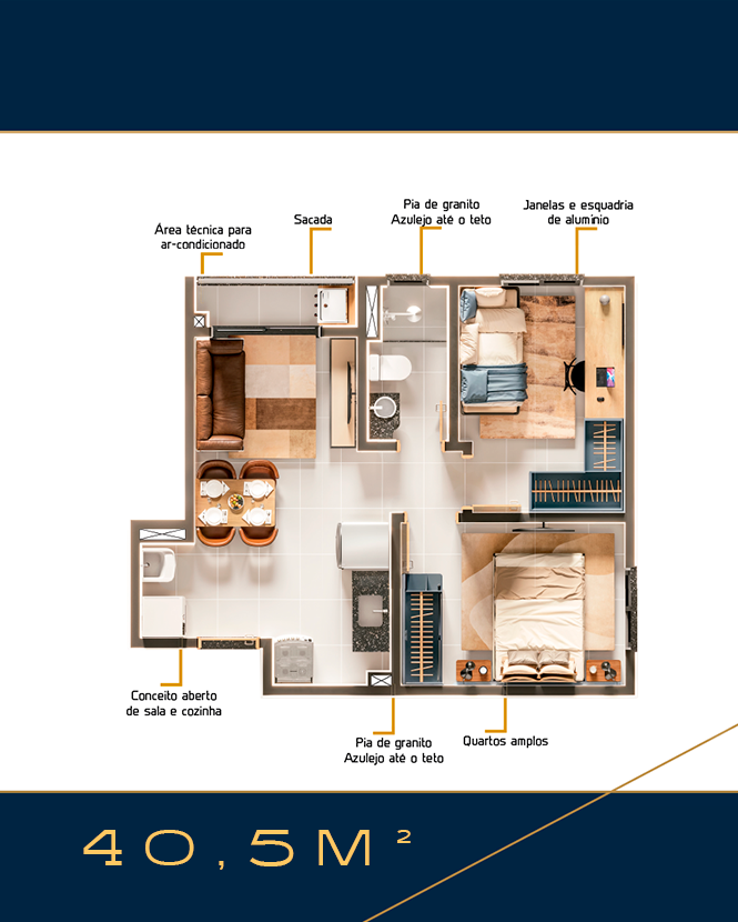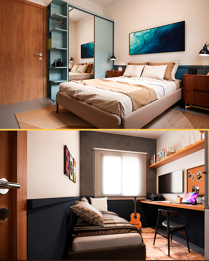 Apartamentos com 1 a 2 dormitórios, opções com suíte, varanda gourmet com ponto para churrasqueira e garagem coberta. Um projeto pensado para oferecer praticidade, bem-estar e uma experiência de moradia que transforma o cotidiano.
