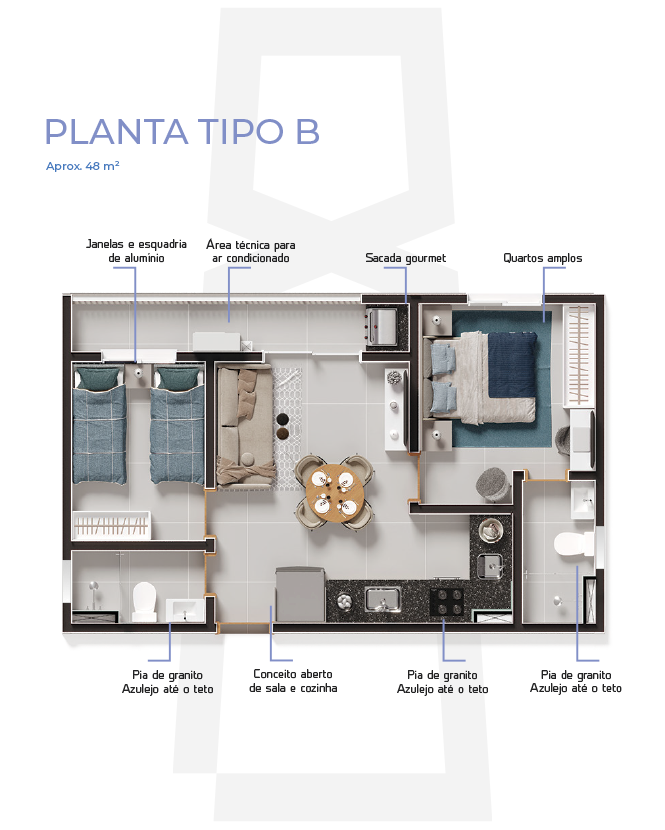 Conforto, estilo e mobilidade urbana em uma localização privilegiada de São Carlos - a 2 quadras do Kartódromo. Apartamentos de aproximadamente 48m2, com ambientes integrados, 2 dormitórios (1 suíte) e sacada gourmet. Área de lazer exclusiva na cobertura, com piscina de 3 níveis com borda infinita: que proporciona a sensação de poder mergulhar no horizonte.