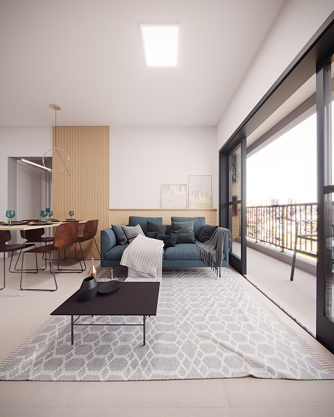 O projeto foi elaborado para entregar aos moradores uma experiência única, confortável e luxuosa. Alcançamos a perfeita harmonia entre luz e paisagens incríveis da cidade, que estão por toda parte no empreendimento. A Sacada Gourmet com portas amplas permite a entrada de muita luz solar e uma bela vista da sala.