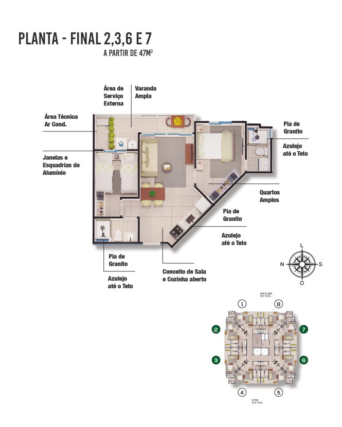 Três torres em uma área de quase nove mil metros quadrados. Cada torre possui uma luxuosa área de lazer com Área de Churrasco, Playground, Lounge, Crossfit e Piscina com Borda Infinita, tudo isso com uma vista maravilhosa da cidade. São dois elevadores por torre, apartamentos a partir de 47m2, com dois banheiros, dois quarto (sendo uma suíte), área de serviço externa, varanda ampla e área técnica para ar condicionado.